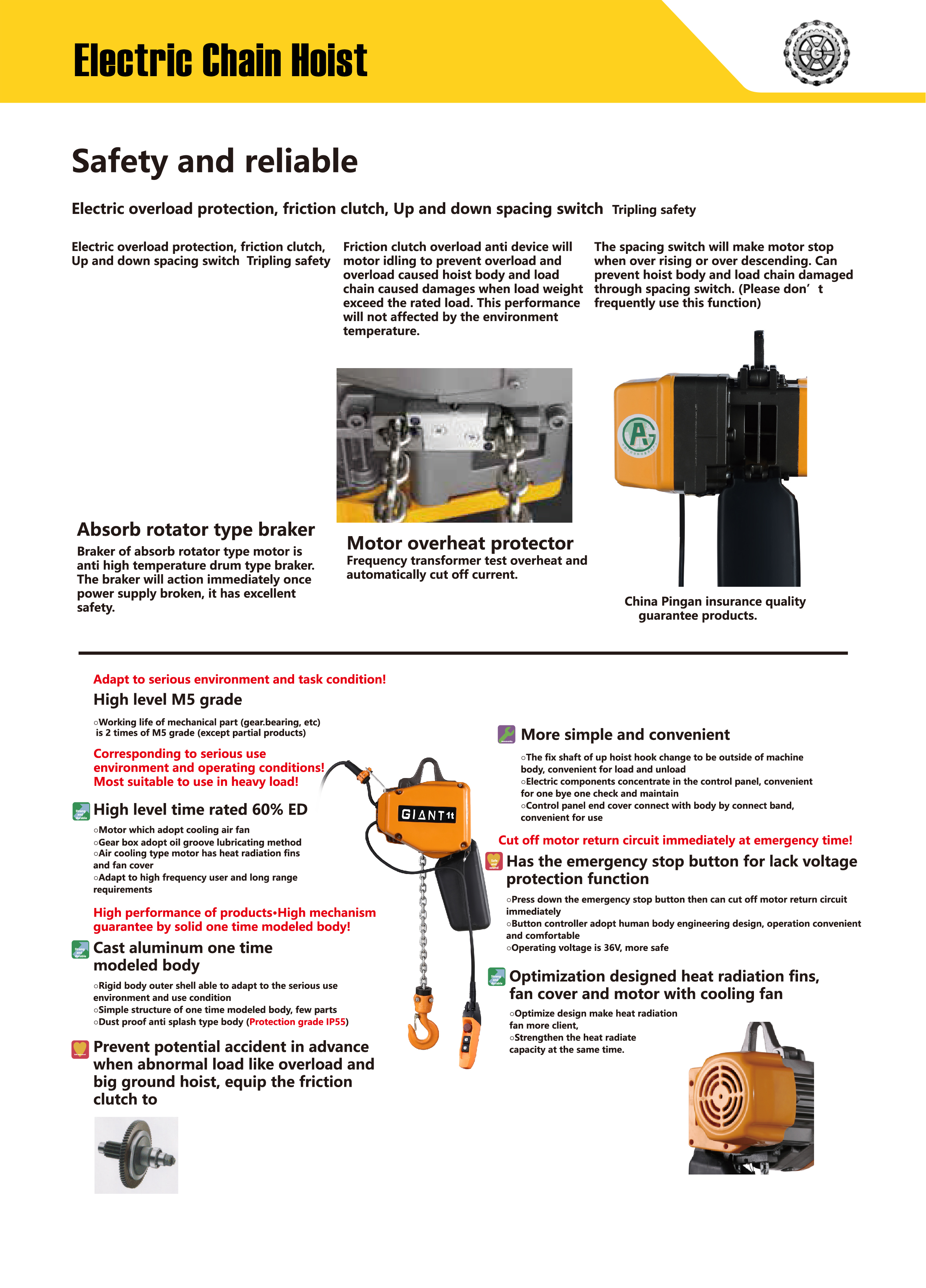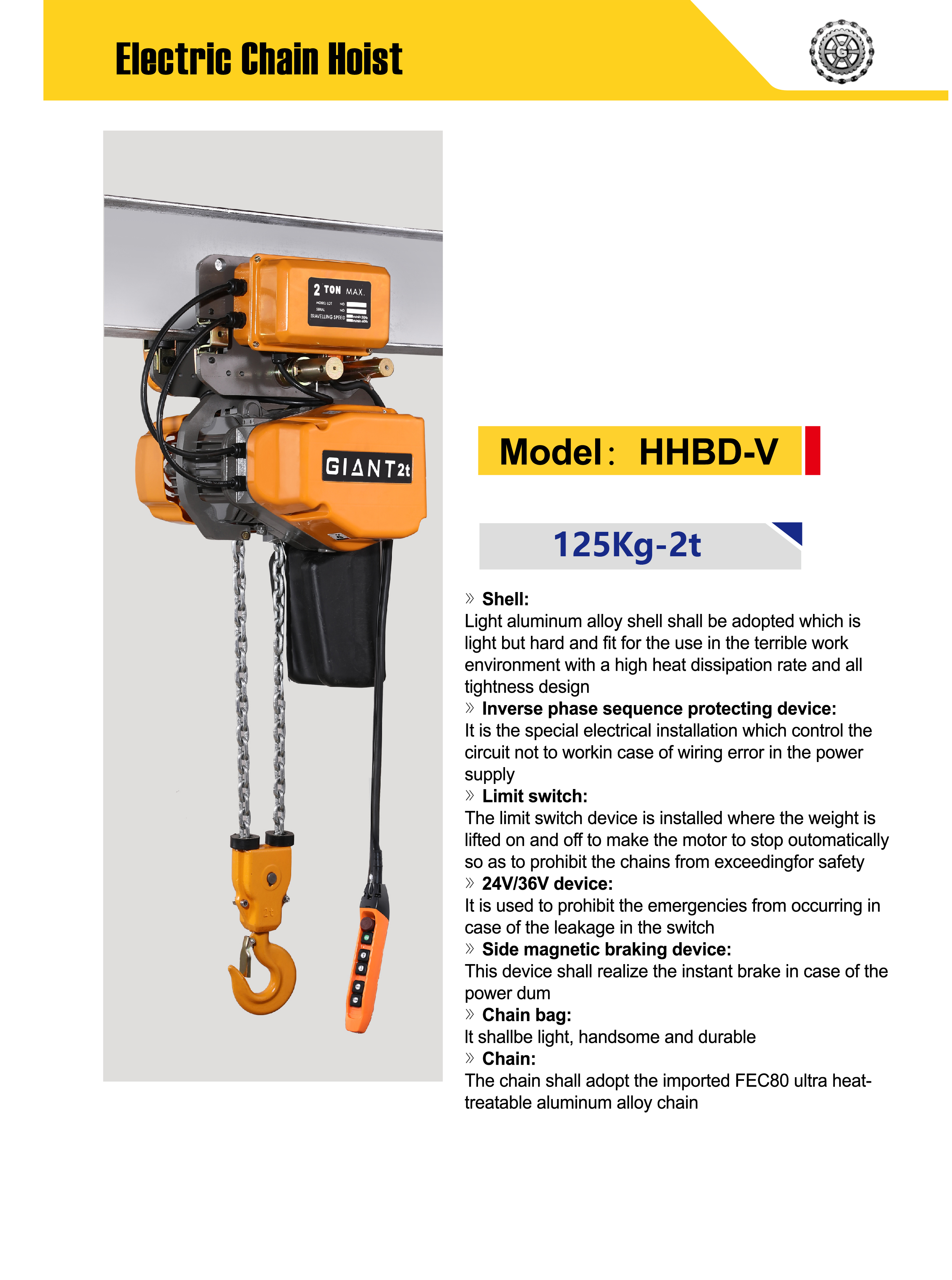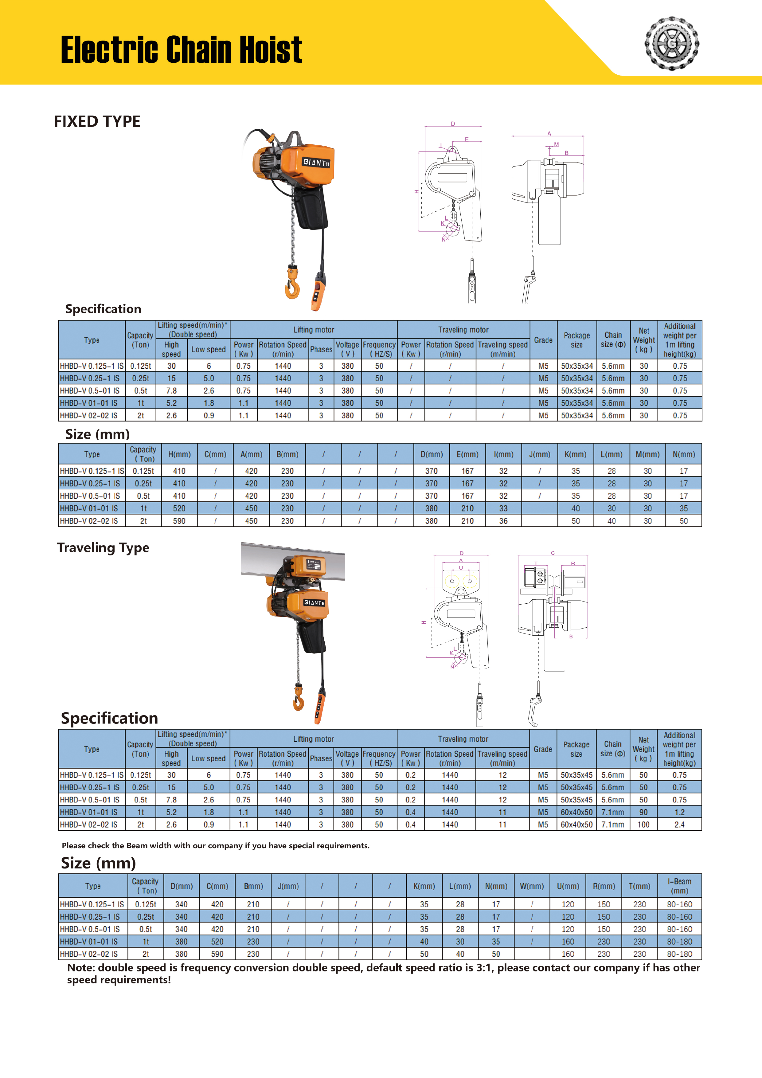 | Typ | Kapacitet (Ton) | Lyfthastighet (m/min)* (Dubbel hastighet) | Lyftmotor | Åkmotor | Kvalitet | Paketstorlek | Kedjestorlek ( Φ ) | Nettovikt (kg) | Extra vikt per 1 m lyfthöjd (kg) | |||||||